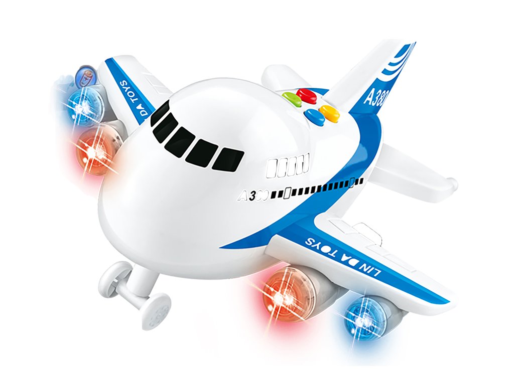 Letadlo na setrvačník s efekty. Rozměry 21x22x13,5 cm. Na setrvačník. Vydává světelné a zvukové efekty. Aktivace tlačítky na střeše. 2xAA baterie nejsou součástí.