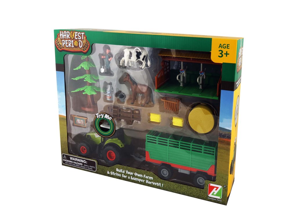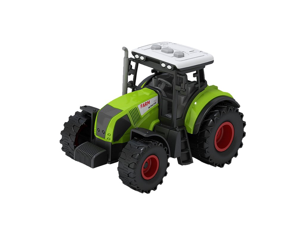 Velký farmářský plastový traktor s vlečkou na seno a příslušenstvím. Tento set je důležitým pomocníkem pro každého malého hospodáře. Zmáčknutím některého z tlačítek na střeše, traktor vydává reálné zvuky a bliká. Funguje na 3 ks baterií typu AG13/LR44, které jsou součástí balení.