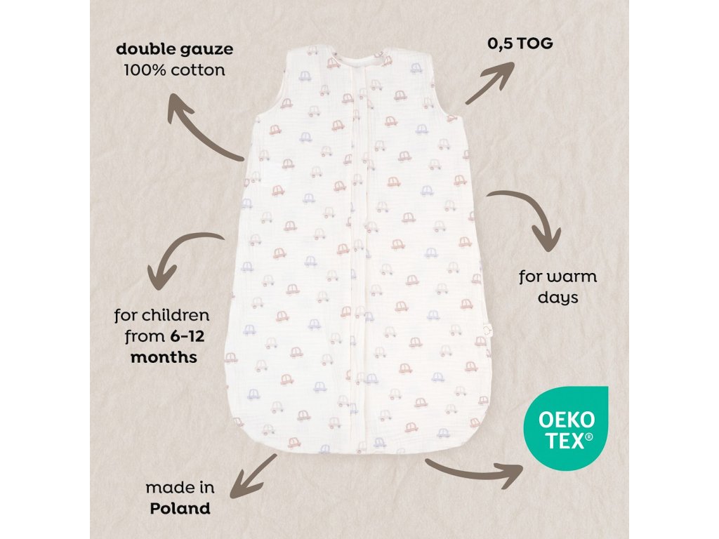 Tento spací pytel z limitované edice kolekce Cotton Muslin Print (0,5 tog) je vyroben z mušelínu a je perfektním řešením pro zajištění pohodlného spánku pro nejmenší v teplejších dnech. Mušelín, je 100% přírodní bavlna s volnou vazbou, díky čemuž je neuvěřitelně jemný, měkký a prodyšný. Díky této látce je spací pytel s každým praním ještě měkčí a jeho přirozený sklon k mačkání eliminuje nutnost žehlení. Mušelín je ceněn pro své antialergické vlastnosti a výraznou zvrásněnou texturu, která zdůrazňuje jeho měkkost.