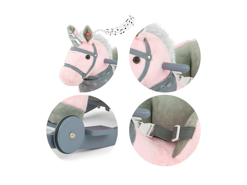 Měkoučký houpací koník Polly byl navržen pro nejmladší děti, pro které jsou tradiční houpací koně příliš velké. Pohodlné a tvarované sedadlo ve tvaru křesla a nastavitelné popruhy poskytují pohodlí a bezpečnost během bezstarostného houpání vašeho dítěte. Opěrky pro nohy na lištách a rukojeti ještě více pomáhají udržet rovnováhu. Překlopením jednoduchého mechanismu na lištách vysunete kolečka, čímž ve vteřině změníte houpací hračku v jezdícího koníka. Houpací lišty lze jednoduše odšroubovat. Po stisknutí ouška koník vesele zařechtá, po stisknutí druhého vydá zvuk klusajícího koně. Baterie se vkládají do poudra umístěného na bříšku.