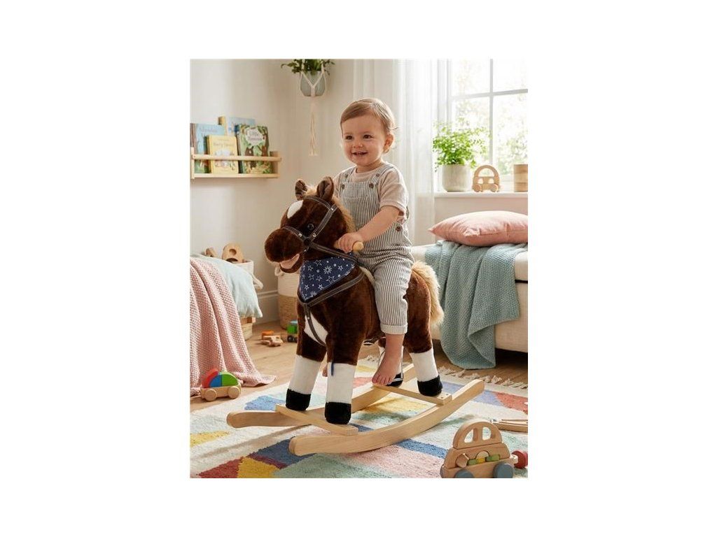 Měkoučký houpací koník Baby Mix byl navržen pro děti, které mají rády dobrodružství. Vypadá jako opravdový, takže se vaše dítě bude cítit jako skutečný jezdec. Koník je vyroben z měkkého plyše, kolem krku má ozdobný šátek a je vybaven dřevěnými houpacími lištami, jejichž profil chrání dítě před převrácením. Pohodlné sedlo, pevná uzda, kovové třmeny, dřevěné rukojeti a stabilní houpací lišty zajistí vašim kovbojům ještě větší stabilitu a pohodlí během houpání. Je vyroben z měkkého plyšového materiálu, pevné dřevěné lišty nebo rukojeti lze snadno odšroubovat. Po stisknutí tlačítek na ouškách koník vrtí ocáskem, hýbe tlamičkou, ozvou se zvuky cvalu, koník zařehtá a zazpívá kovbojskou písničku. Tři potřebné baterie AA 1,5 V se vkládají do pouzdra umístěného na bříšku koníka a nejsou součástí balení. Během houpání se dítě učí koordinovat pohyby svého těla s koníkem, což zlepšuje celkovou rovnováhu a motoriku dítěte.