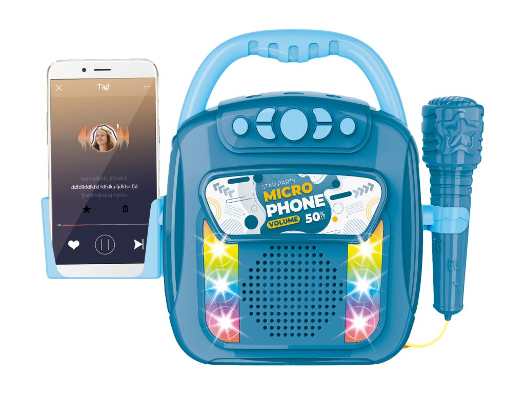 Hudební box s mikrofonem a bluetooth. Velikost 28 cm. Bateriový pack 3.7V součástí balení. Obsah balení - hudební box, USB nabíjecí kabel, držák na mobilní telefon, mikrofon. Vydává světelné efekty. Bluetooth propojení s mobilním telefonem. nahrávání, nastavení hlasitosti, přepínání písniček. Podrobný návod na obalu i v balení.