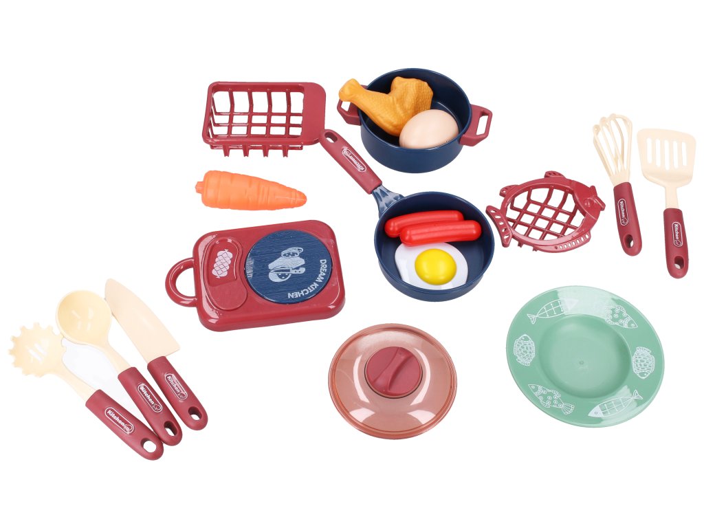 Kuchyňský set. Součástí vařič, nádobí a jídlo.
