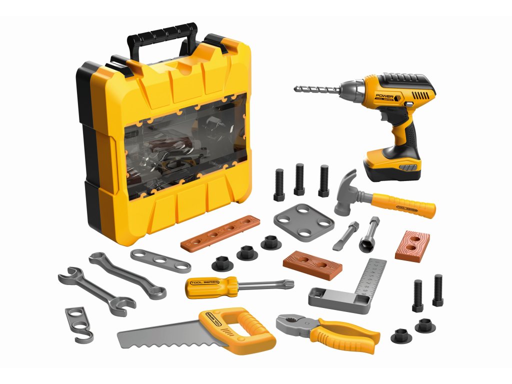 Nářadí v kufříku. Rozměry kufříku 26x9x25,5 cm. Světelné efekty. 3xAAA baterie do vrtačky nejsou součástí. Přepínač ON/OFF na vrtačce. Součástí kufřík, vrtačka s náhradními šroubováky, kladivo, kombinačky, pilka, šroubovák, 2 klíče, pravítko, dřívka, šrouby, matice a další.