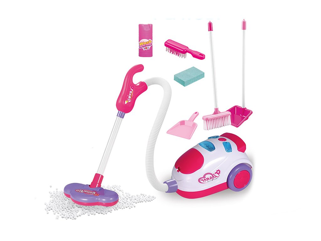 Uklízecí set s vysavačem a efekty 9 ks. Obsah balení - vysavač, smeták a smetáček, malá a velká lopatka, kuličky k vysávání, sprej, houbička. Vydává světelné efekty. Baterie 3xAA, nejsou součástí balení. Vysavač po zapnutí vypínače vysává polystyrenové kuličky. Otevřením vysavače lze kuličky vysypat.