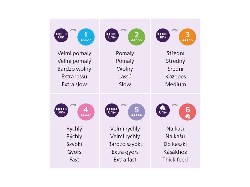 Nově přecházíme na průtokový systém založený na tempu při pití. Začněte s dudlíkem, který je součástí láhve. Pokud dítěti mléko vytéká z úst nebo pokud mléko hltá, zkuste nižší průtok. Pokud si dítě místo pití s dudlíkem hraje nebo se zdá být frustrované, zkuste vyšší průtok. Než toto nové provedení zcela zavedeme, můžete obdržet oba typy balení.