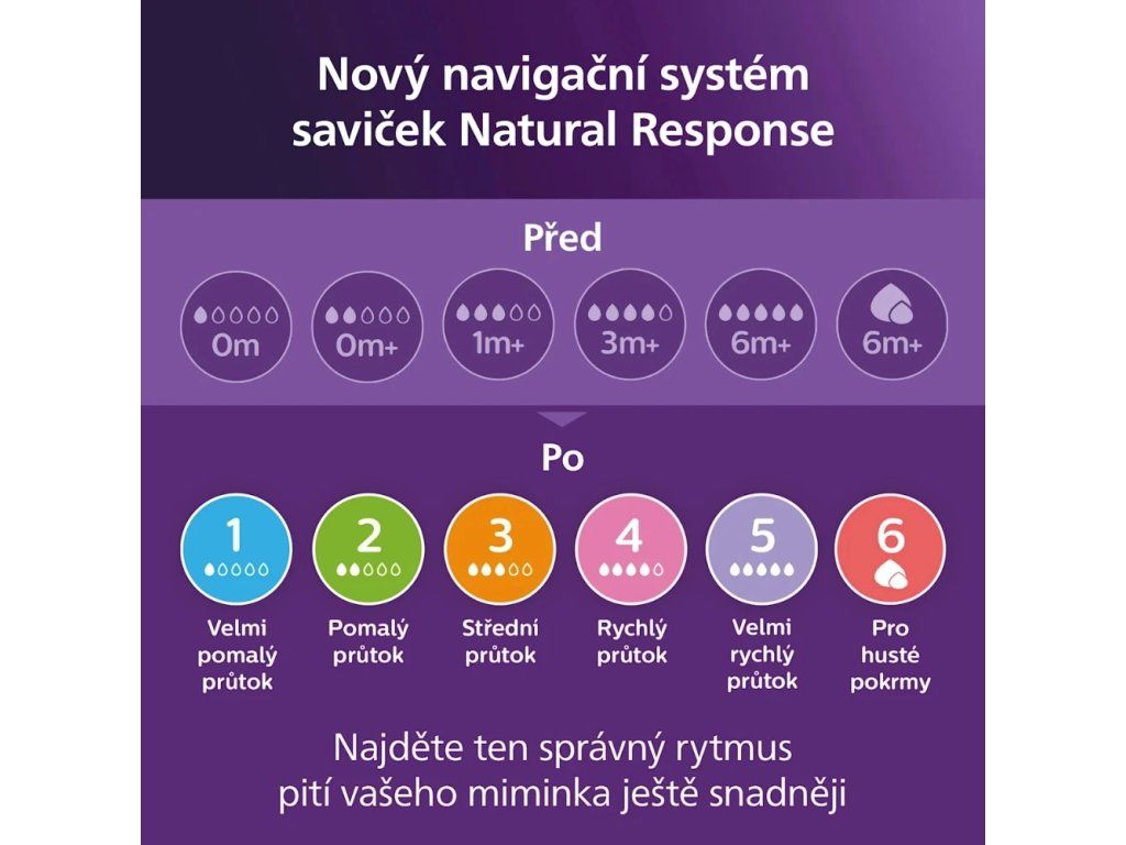 Dudlík Natural Response funguje v souladu s přirozeným rytmem krmení dítěte, takže lze snadno kombinovat kojení a krmení z lahve. Má unikátní otvor, který uvolňuje mléko pouze tehdy, když dítě aktivně pije. Když tedy dítě pití přeruší, aby polklo a nadechlo se, tok mléka se přeruší také.
