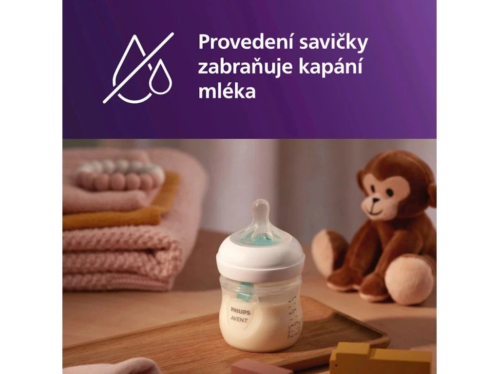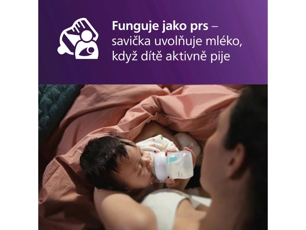 Zajišťuje klidné, pohodlné krmení. Savička Natural Response podporuje přirozený rytmus sání, polykání a dýchání dítěte a ventil AirFree je navržen tak, aby odváděl vzduch z bříška a snížil riziko koliky, nadýmání a refluxu.