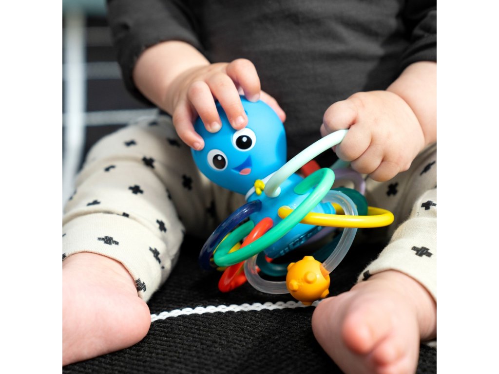 Hračka na kousání a chrastítko Baby Einstein Ocean Explorers pomáhá uklidnit bolavé dásně a stimulovat smysly dítěte díky různým texturám, jasným barvám a skrytému chrastítku. Toto barevné kousátko podporuje rozpoznávání barev a skryté chrastítko odměňuje zvědavost dítěte při každém zatřesení.