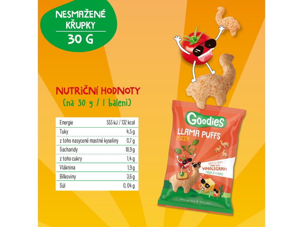 Složení: celozrnná pšeničná mouka 52,5 %, kukuřičná mouka 21,5 %, slunečnicový olej 13 %, sýrový prášek [sýr čedar (mléko, mikrobiální syřidlo, jedlá sůl), sušené odtučněné mléko] 6,5 %, sušená rajčata 4,3 %, sušená mrkev 1,2 %, sušená cibule 0,5 %, sušené oregano 0,4 %, sušená bazalka 0,1 %. Může obsahovat skořápkové plody a sóju.