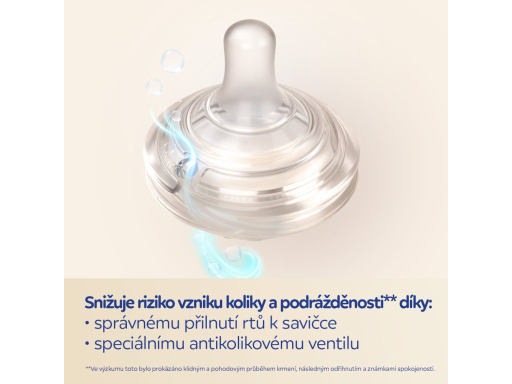 - Elastická špička napodobuje přirozený pohyb matčiny bradavky.