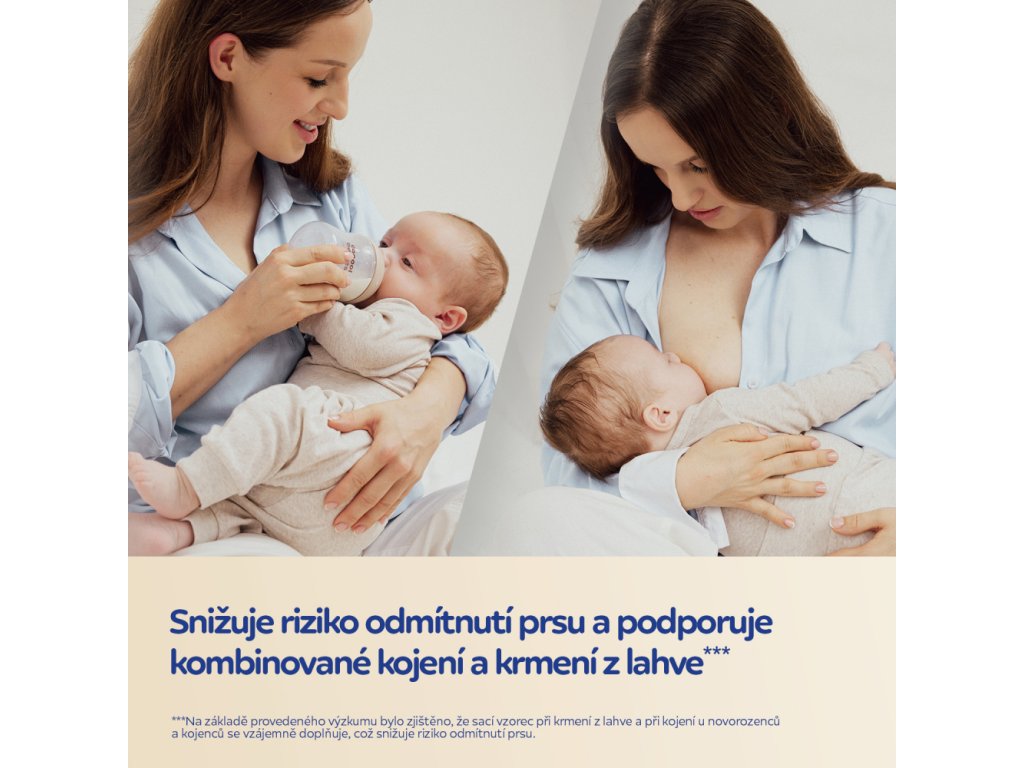 - Snižuje riziko odmítnutí kojení a podporuje střídavé krmení***.