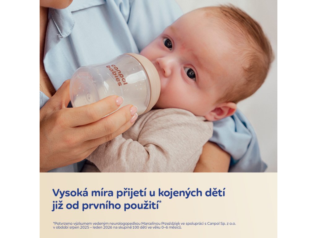 *Potvrzeno ve studii provedené logopedkou Marcelinou Przeździał a společností Canpol Sp. z o.o. mezi srpnem 2025 a lednem 2026, do které bylo zařazeno 100 kojenců ve věku 0 až 6 měsíců.