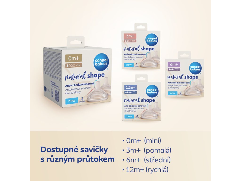 Inovativní antikoliková dvouzónová savička Natural Shape s technologií DuoFlex respektuje přirozený rytmus sání dítěte.