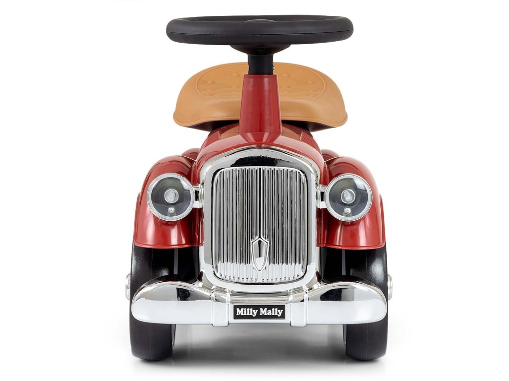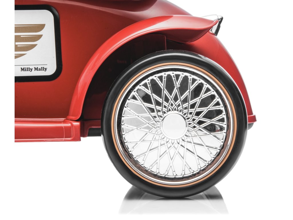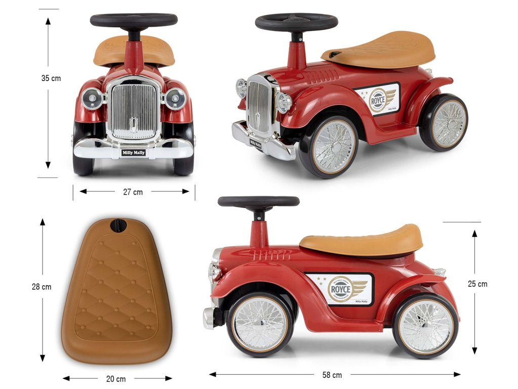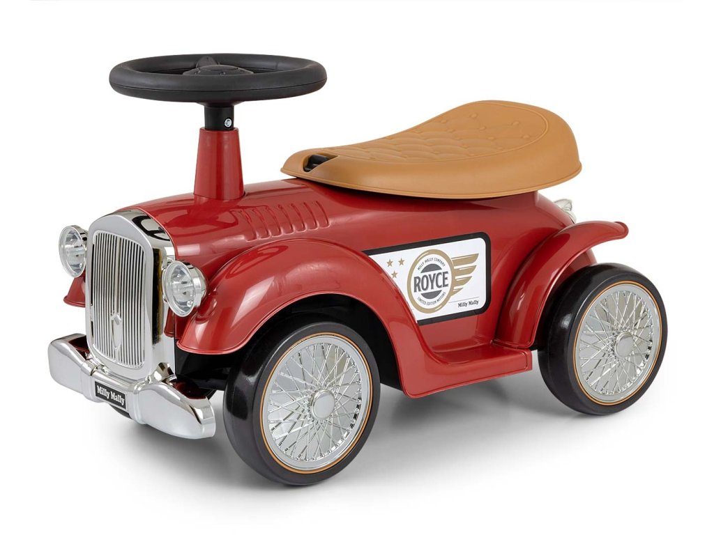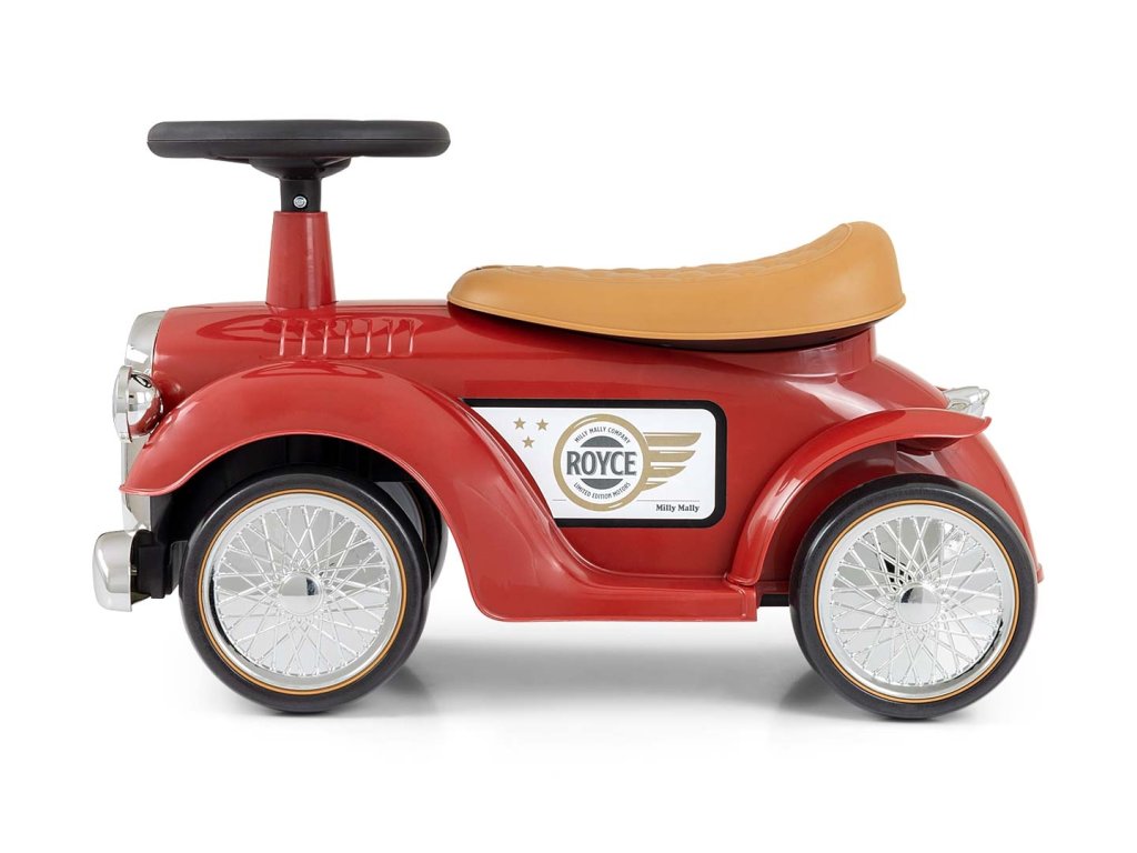Vintige odrážedlo Royce od Milly Mally zve malé cestovatele na retro jízdu. Upoutá svými oku lahodícími barvami. Je bohatě vybaveno. Toto autíčko má volant se zvukem a tvarované sedadlo. Poskytne vašemu dítěti skvělou zábavu při řízení a rozvíjí jeho smysl pro rovnováhu a všeobecné motorické dovednosti. Autíčko má lehkou plastovou konstrukci a ergonomické tvary. Otočný volant našeho jezdce Royce umožňuje náročné manévry doma i na procházkách. Kola tohoto krásného vozidla jsou vyrobena z měkké pěny EVA. Retro autíčko může vaše dítě používat jako své první vozidlo s opravdovým volantem a klaksonem, dále jako kočárek s otevřeným úložným prostorem na hračky (malý kufr), imitací palivové nádrže na zadní části vozidla a přední částí auta - mřížkou ve stříbrné barvě. Logo ROYCE dodává tomuto vozidlu na estetice a prestiži. Závěrečnou tečkou za vozítkem Royce je jeho dárková krabička, která je zachována v charakteru retro vozidel z počátků automobilového průmyslu. Vozítko Royce je určeno všem dětem, které umí samostatně sedět. Vozítko lze používat v interiéru i exteriéru a zpříjemní vašemu dítěti čas strávený na procházce.