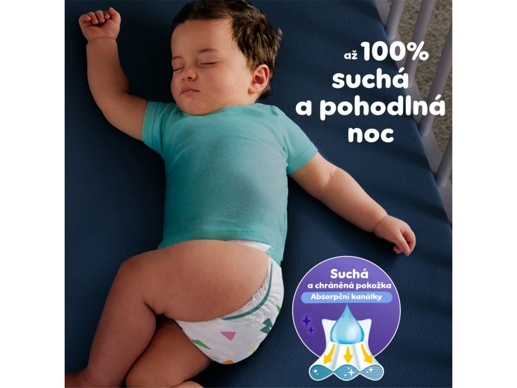 Zároveň jsou příjemné na pokožku, protože povrchová vrstva, která je v kontaktu s pokožkou vašeho dítěte, je hebká a suchá. Mají také pružné upevňovací pásky, které zabraňují protečení a zajistí tedy pohodlný a klidný spánek po celou noc.