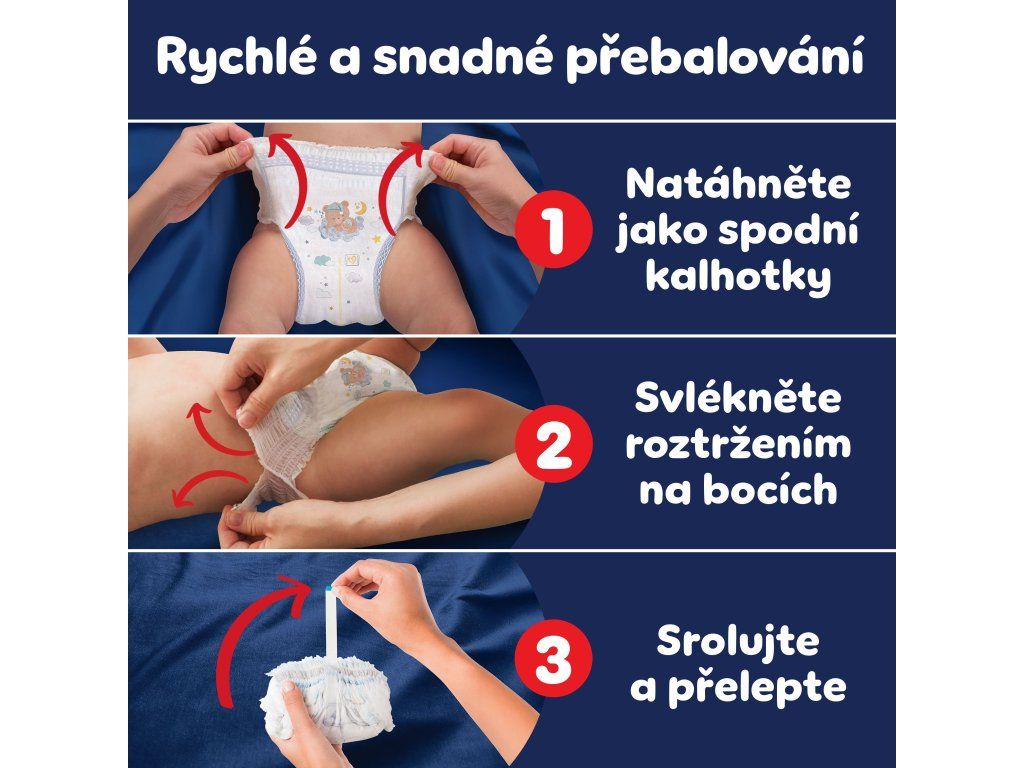 - Snadná výměna - Plenky snadno natáhnete i neposednému dítěti a při svlékání jednoduše roztrhnete na bocích. Potom je srolujete, zajistíte lepícím páskem a vyhodíte.