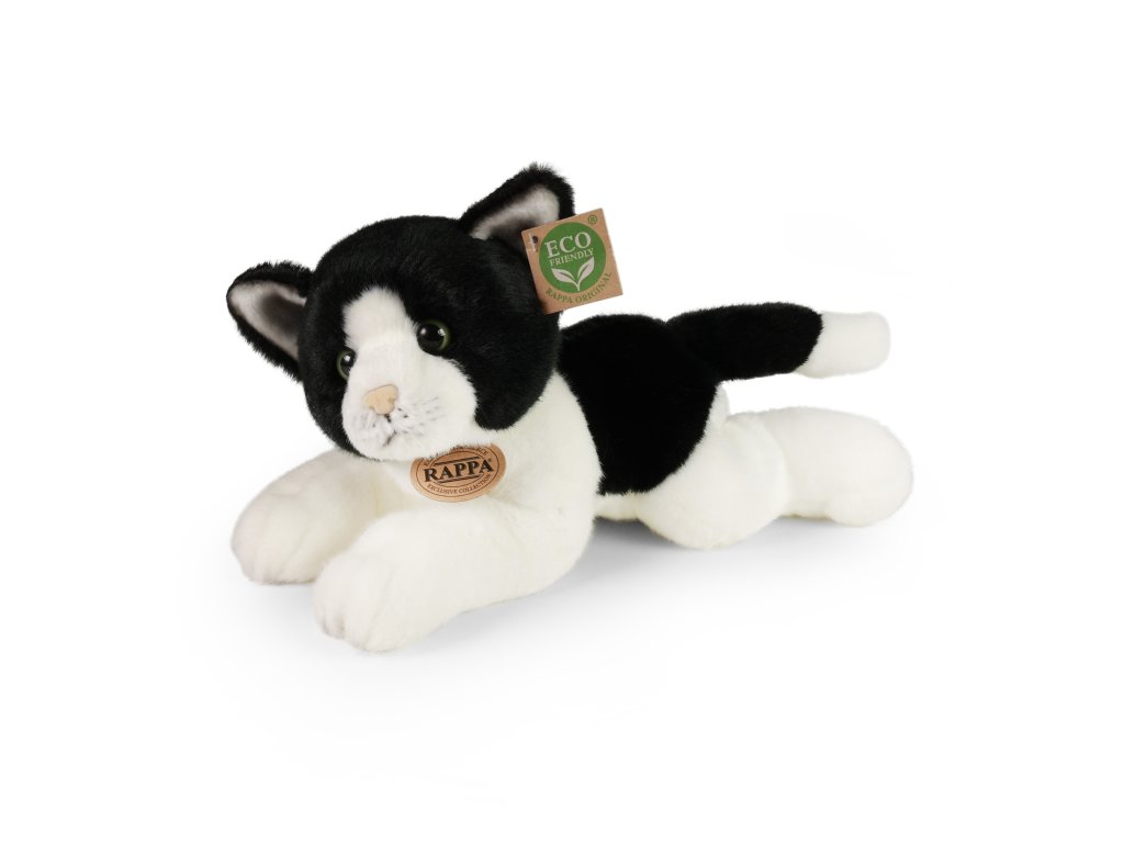 Krásná bílo-černa kočka přece nesmí chybět ve tvé sbírce plyšových zvířátek! Roztomilá kočička o velikosti 30 cm je vyrobena z vysoce kvalitní, heboučké plyše a díky tomu vypadá jako živá a je tak součástí exkluzivní kolekce plyšových hraček RAPPA. Tento plyšový kousek je ideálním dárkem pro malé i velké milovníky plyšáků! Co to vlastně ECO-FRIENDLY znamená? Výplň plyšové hračky je vyrobena z recyklovaných PET lahví. Tento materiál je zcela bezpečný, na omak nerozeznatelný od standartní výplně a plně atestovaný pro bezpečnost i těch nejmenších. Rozhodli jsme se jít zelenou cestou co nejméně zatěžující životní prostředí- cestou ECO-FRIENDLY.