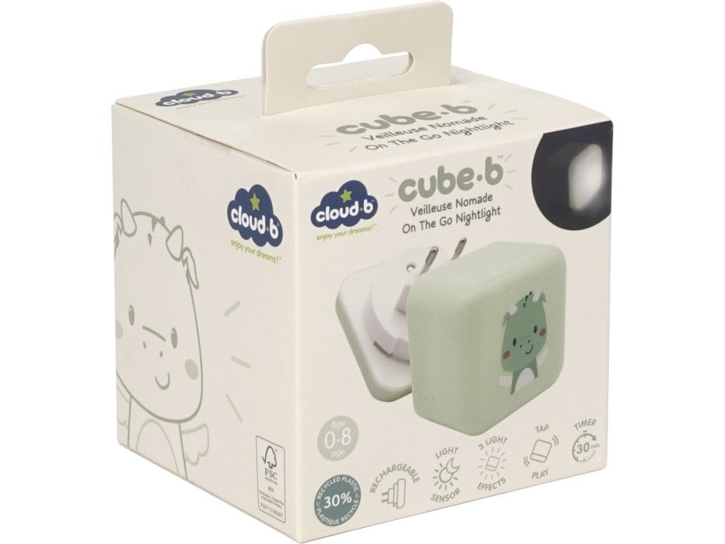 Cube B™ - Drake The Dragon je přenosné noční světlo, které vydává jemné světlo pro uklidnění dětí před spaním. Lze jej používat samostatně nebo zapojit do zásuvky díky dvoudílné základně a krytu, které po sestavení společně svítí a vytvářejí perfektní světelnou kostku. Noční světlo Cube B™ - Drake The Dragon dokáže měnit barvu a intenzitu světla díky intuitivnímu senzoru klepnutí. Po zapojení do zásuvky vydává krásné, uklidňující bílé světlo, které v ložnici nabízí uklidňující atmosféru. Při přenosném použití rozptyluje bílé světlo pro jemnou atmosféru a poté jednoduchým dotykem uklidňující zelené světlo, které lze více či méně intenzivní. Cube B™ - Drake The Dragon je noční společník pro vytvoření jemných a klidných nocí pro miminka a děti. Díky kompaktní velikosti ho starší děti snadno uchopí, když se orientují ve tmě, aniž by vzbudily rodiče. Je vybaveno časovačem, který automaticky vypne světlo, aby po usnutí zajistil úplnou tmu. Cube B™ - Drake The Dragon bdí nad vašimi dětmi s láskou a laskavostí. Noční světlo Cube B™ je vyrobeno z 30 % recyklovaného plastu a dobíjí se přímo ze zásuvky.