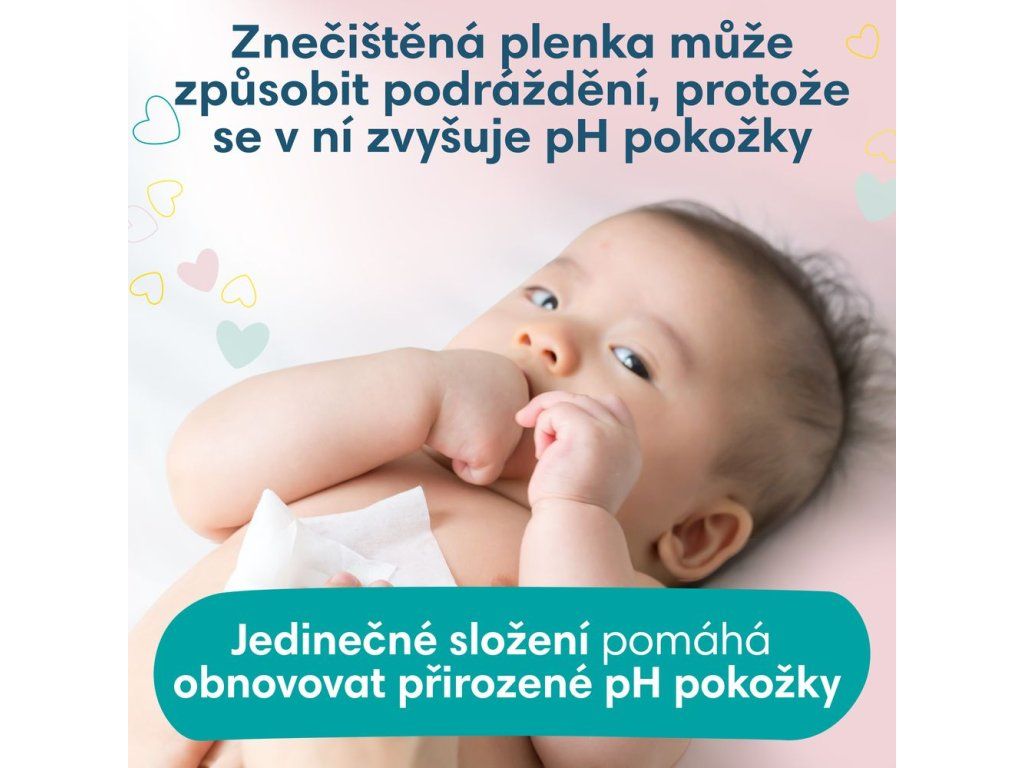 Enzymy v moči a stolici mohou narušovat přirozené pH pokožky vašeho miminka, což zvyšuje riziko podráždění a opruzenin. Ubrousky Pampers Sensitive kombinují čistou vodu s jemnými ochrannými složkami, které obnovují přirozenou hodnotu pH a chrání pokožku před podrážděním, čímž podporují zdravou a pohodlnou pokožku během každého přebalování.