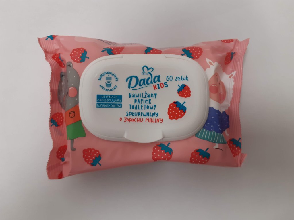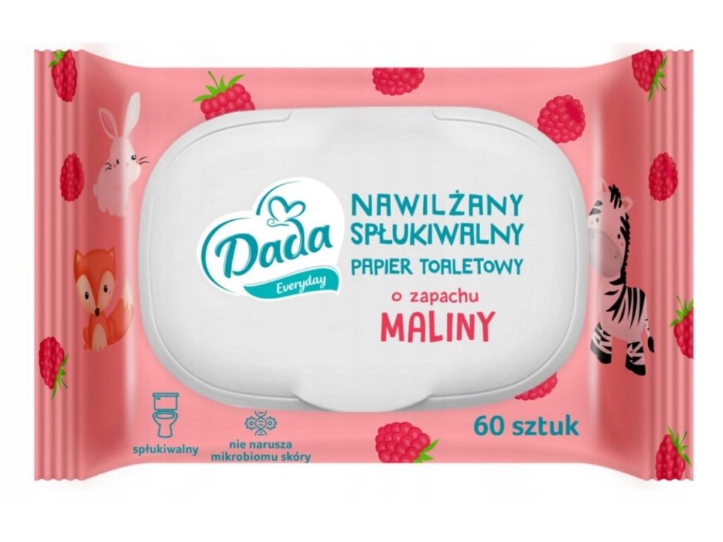 Splachovatelný, vlhčený toaletní papír Dada s příjemnou ovocnou vůní a s výtažkem z heřmánku, alantoinem a panthenolem.